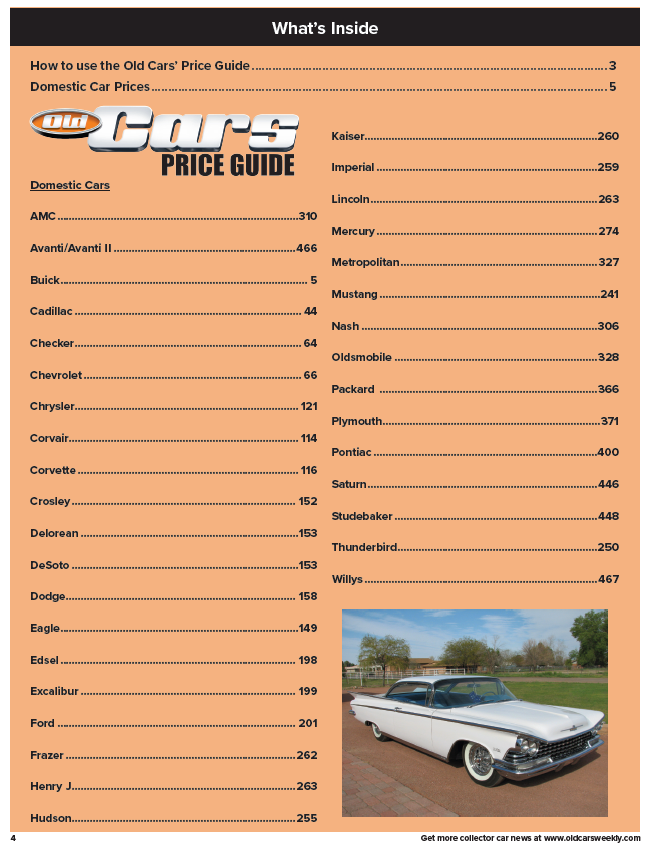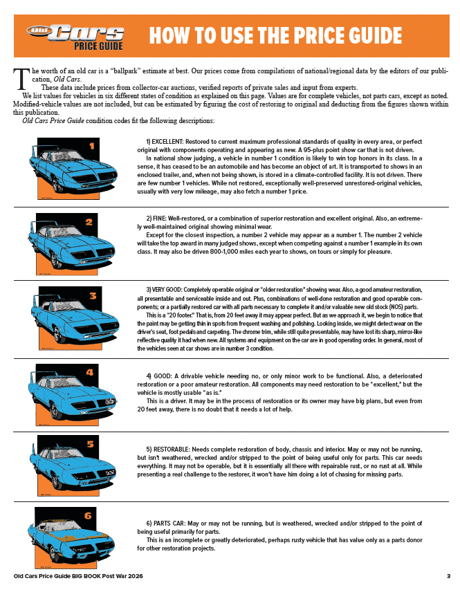 Old Cars Price Guide breaks down the pricing into straight-forward six grades of condition and comes fully vetted by the leaders in the car-collecting hobby.