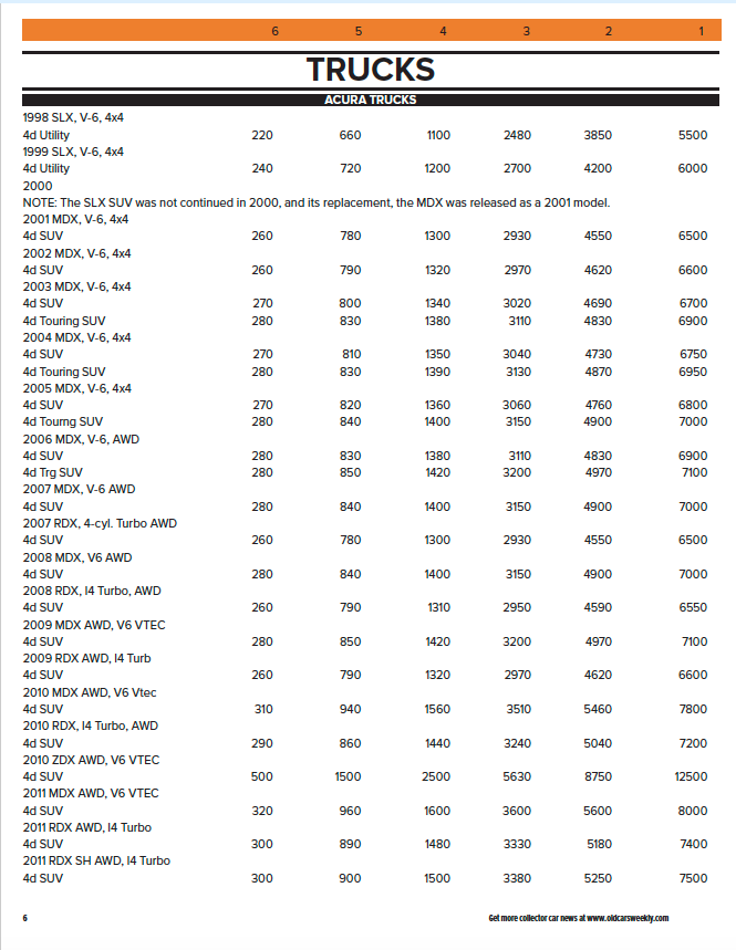 - Values listed in six condition grades, as established by Old Cars